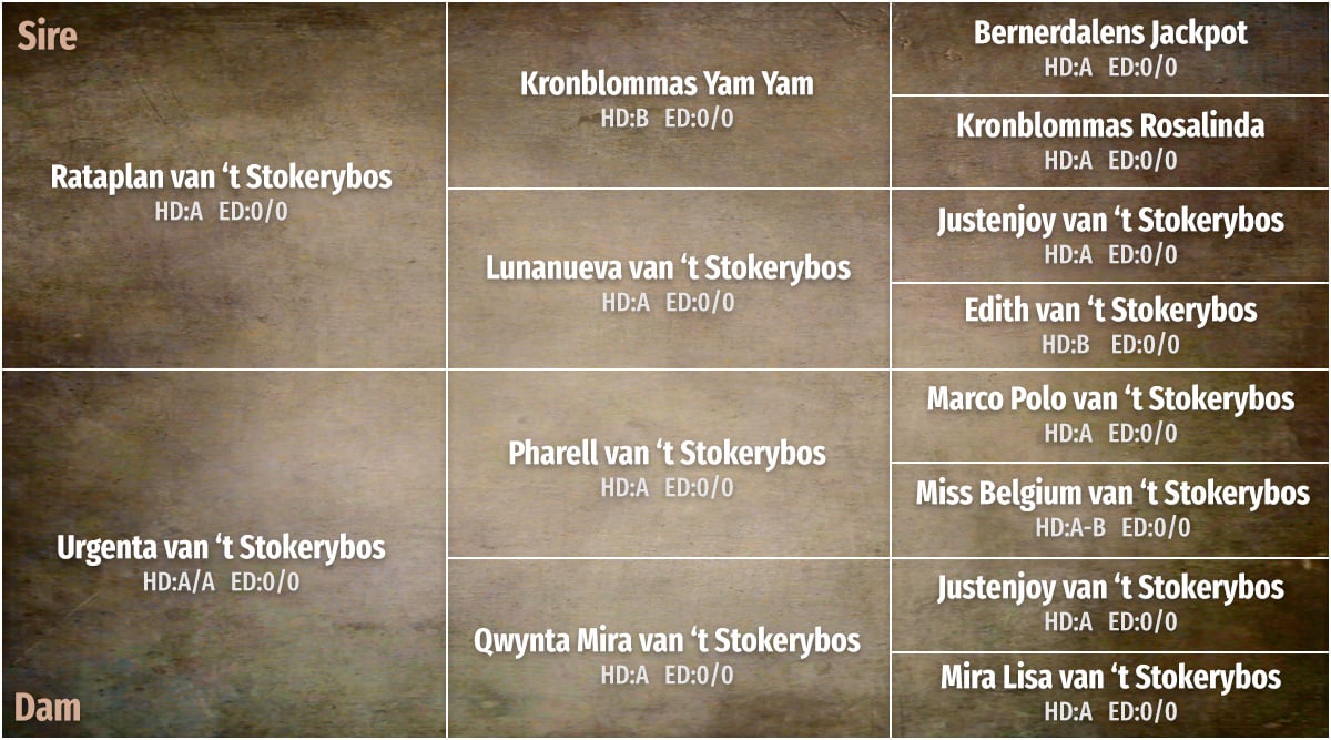 Date of birth: 19/02/2024HD:A/AED: 0/0LUXEMBOURG CHAMPIONSire: Ch. Rataplan van 't StokerybosDam: Ch. Urgenta van 't Stokerybos